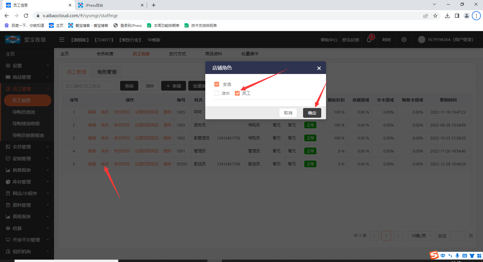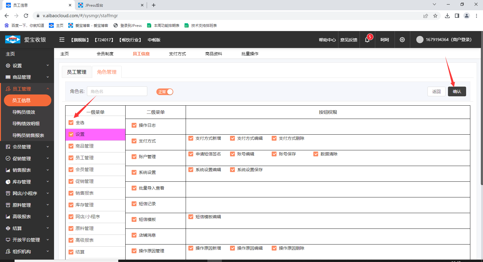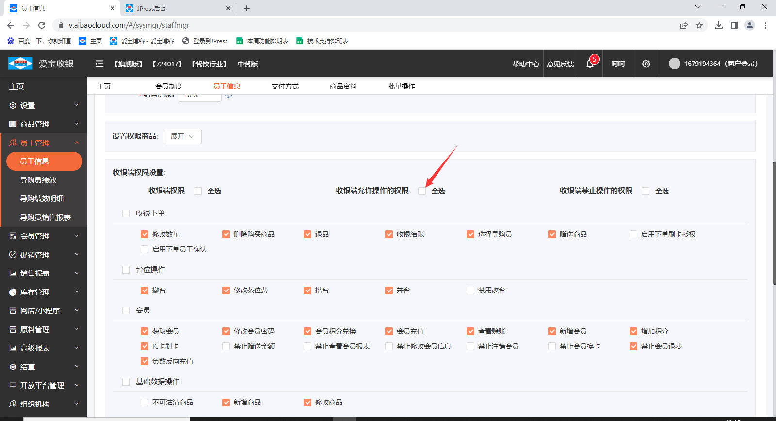 如果勾选了员工允许收银端操作,还是提示该账号无权登录