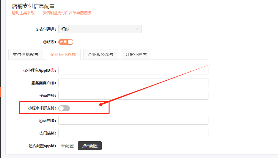第三步:支付通道选择【好哒】,在【企业版小程序】中填写获取到的配置信息;