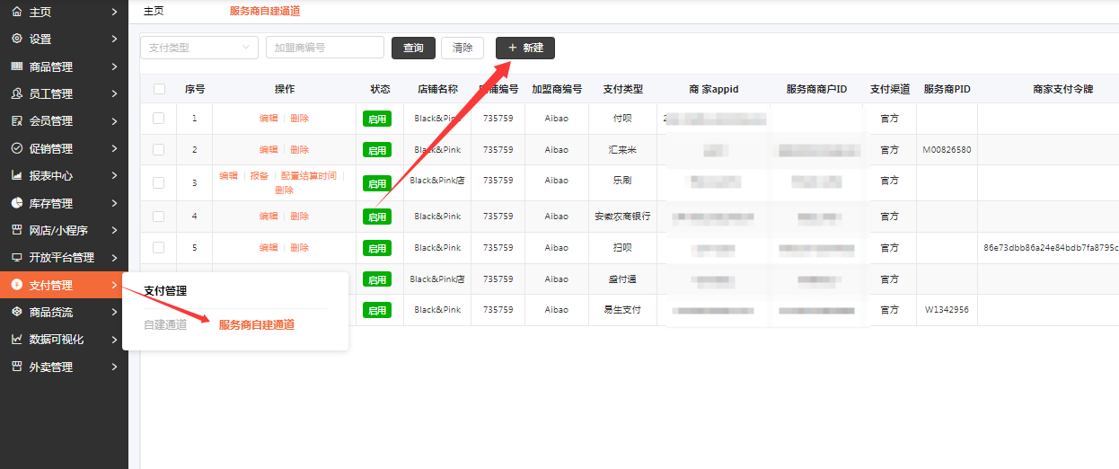 第二步:在【支付管理】----【服务商自建通道】---点击【新建】(之前自建填写过好哒,点击下面编辑)