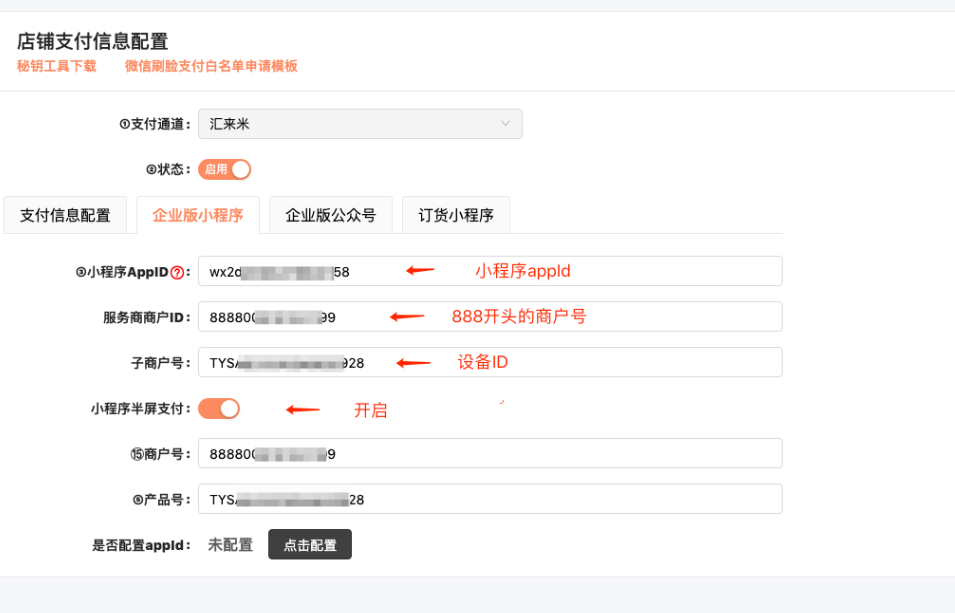 第三步:支付通道选择【汇来米】,在【企业版小程序】中填写获取到的配置信息;