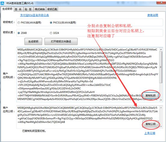 生成后密钥后分别复制公、私钥到美食云后台对应选项,同时把公钥复制到开放平台密钥里的接口加密方式-设置里
