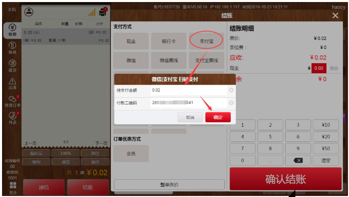 注意:选择支付扫描客户的支付宝付款码付款结账查看是否金额入账!!!