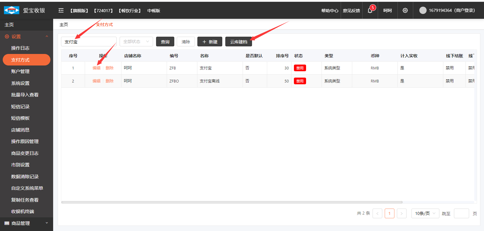 在后台【设置】中选择【支付方式】,搜索支付宝如果没有或者在“云库建档”添加,将【支付宝支付】启用即可