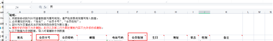 打开模板如图,“姓名”,“会员卡号”,“会员级别”是必须填写的,其余根据个人需求填写,注意,如果要填写性别的话,只能填写男/女,如果填写先生/小姐这类会报错,导入失败。