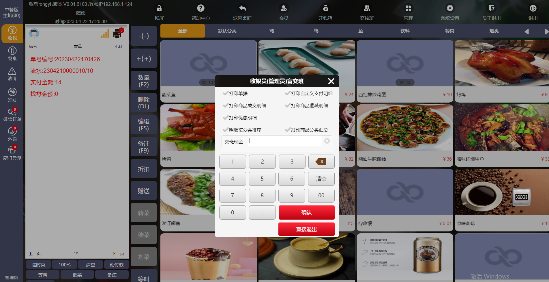 配置生效后再返回前台点击交班就已经不显示营业额度了