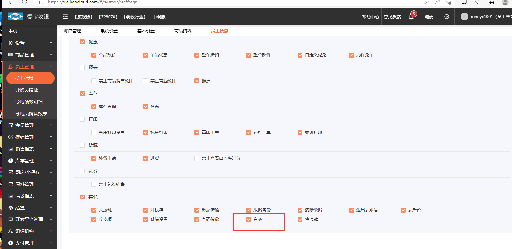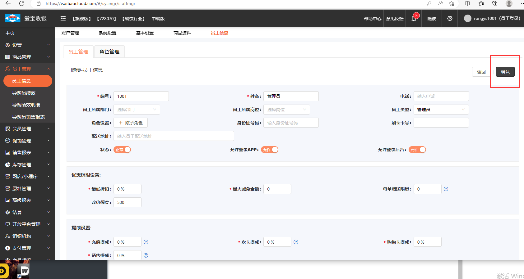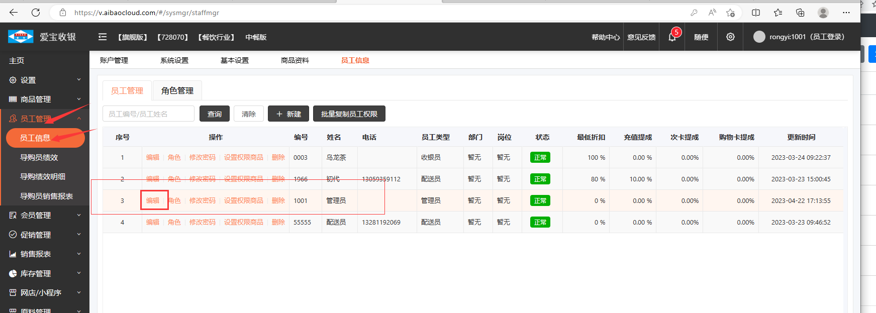 在员工管理中找到员工信息,找到相对于不想让其看到营业额度的员工,点击编辑,我这里测试用的是1001,所以选择了编辑1001的信息