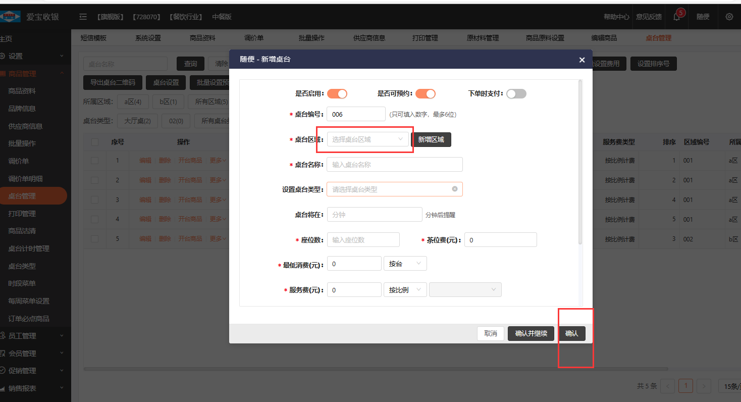 设置完成后如果需要继续增加桌台可以点击确认并继续,不需要就直接点确认