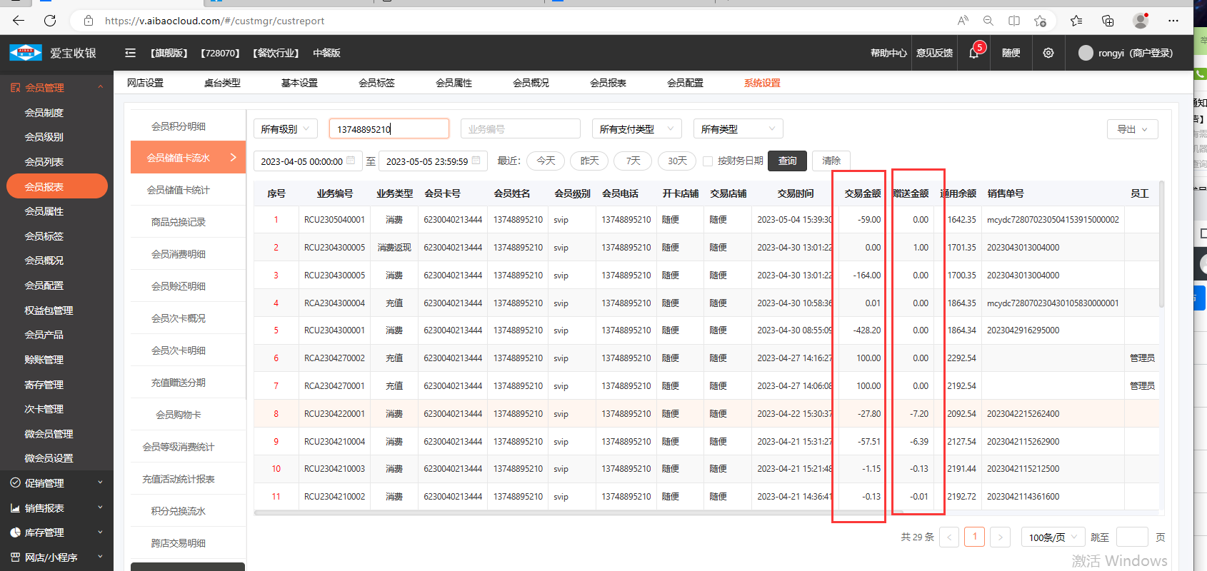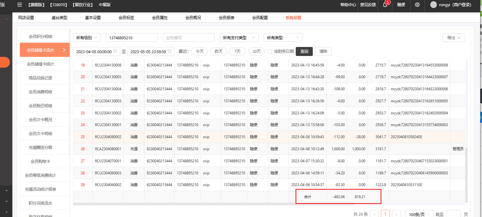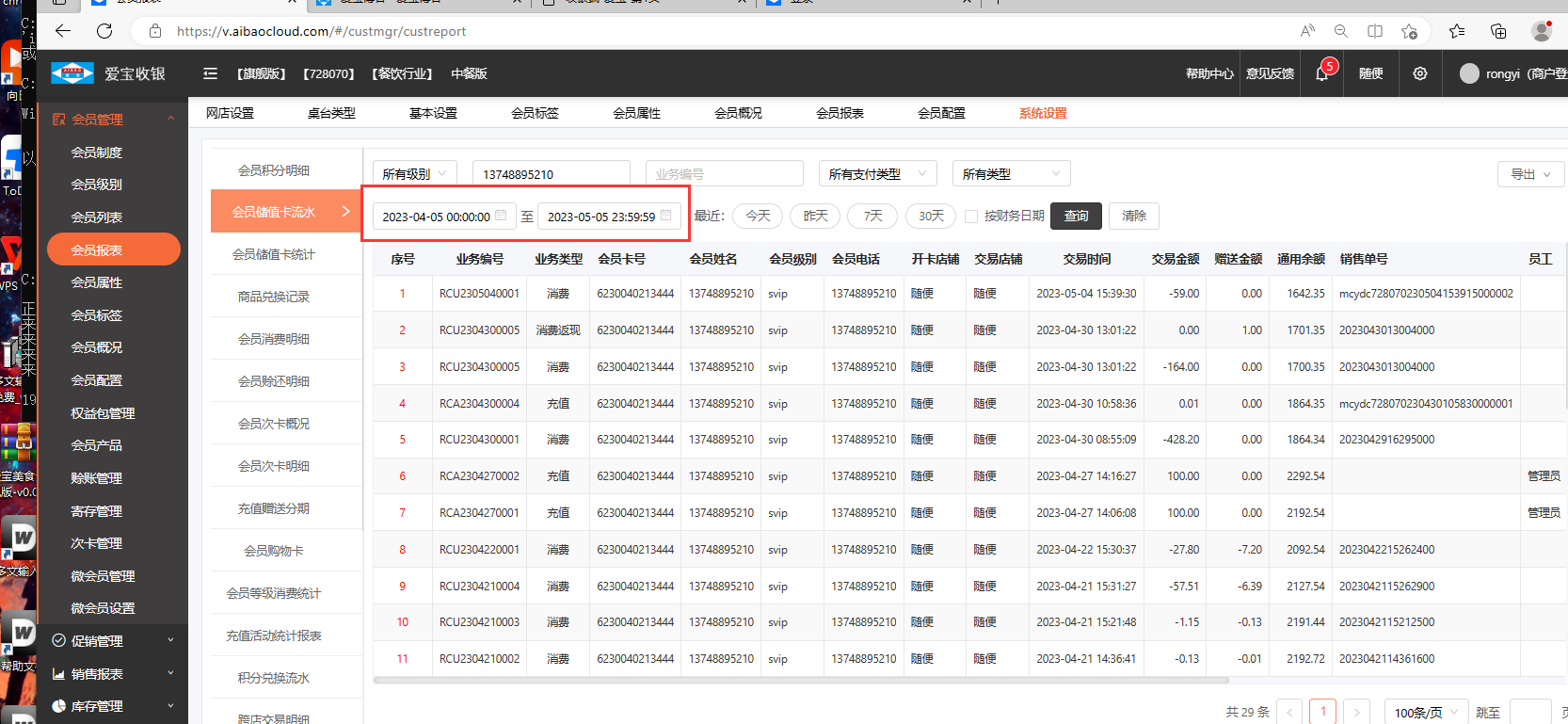 在会员管理中找到会员报表,点击会员充值卡流水