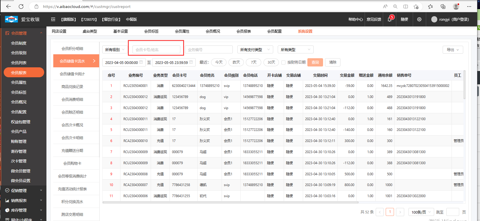 如果需要查找特定一个客户的流水,在红框处输入会员卡号或者姓名进行查找