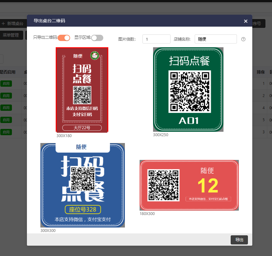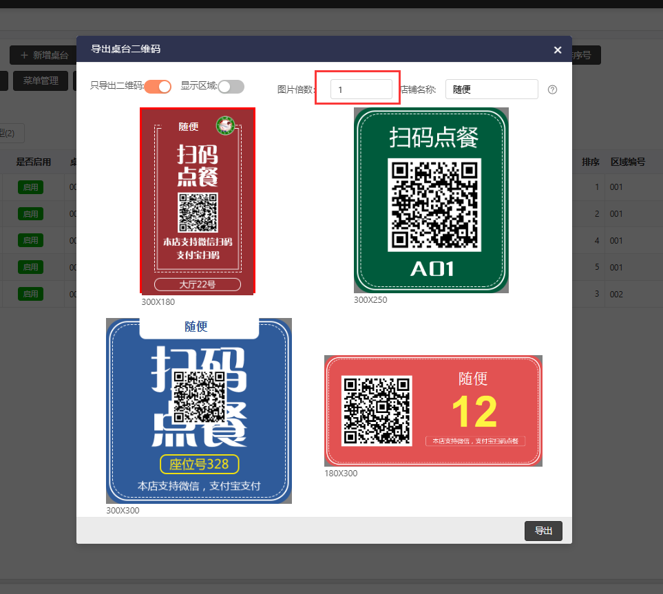 在商品管理中找到桌台管理。点击导出桌台二维码