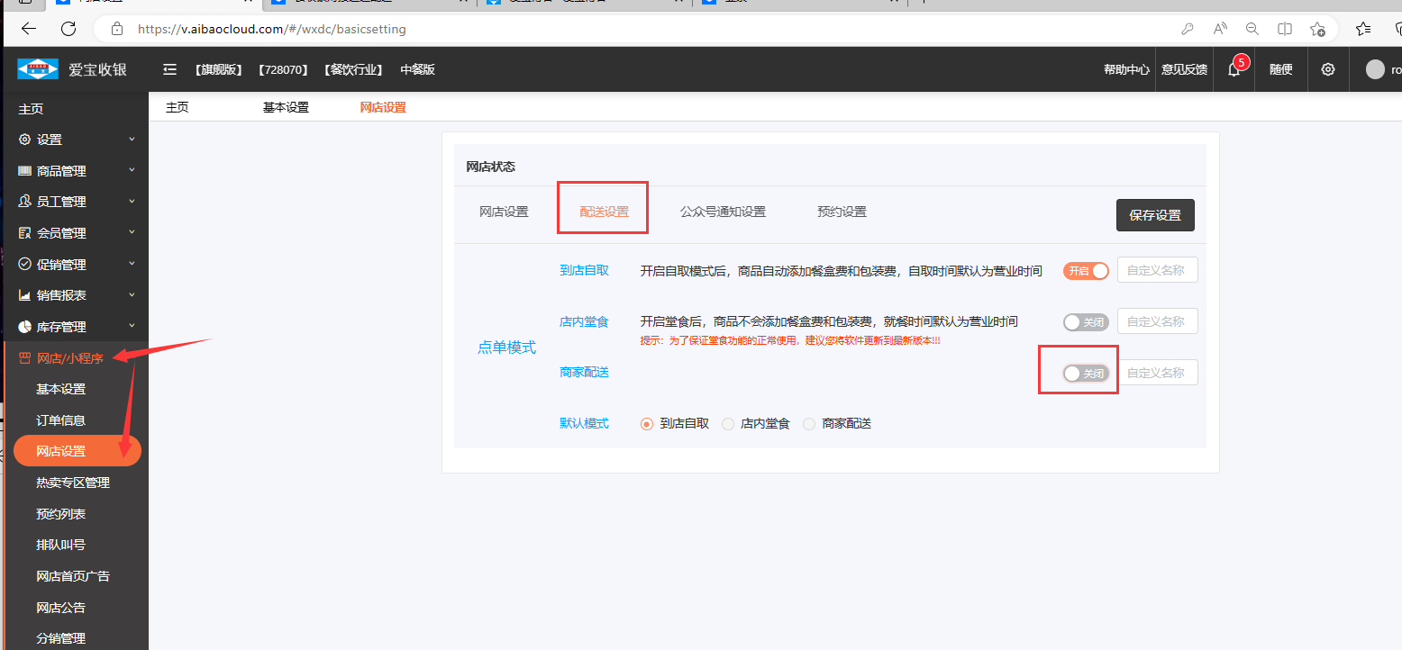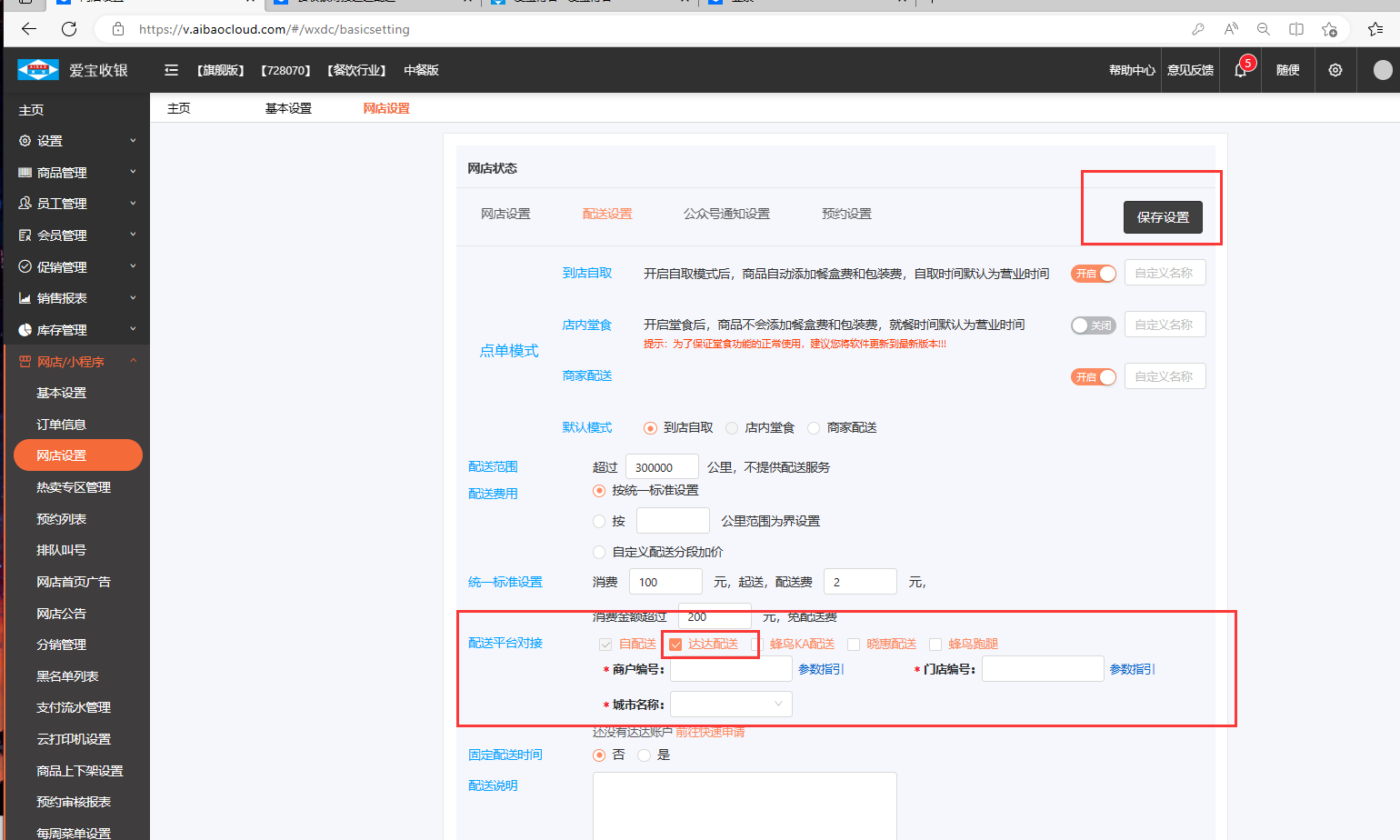 勾选达达配送,填写达达配送信息,填写完成后点击保存设置