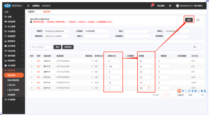 5、输入采购价和采购量,最后点击“保存”;
