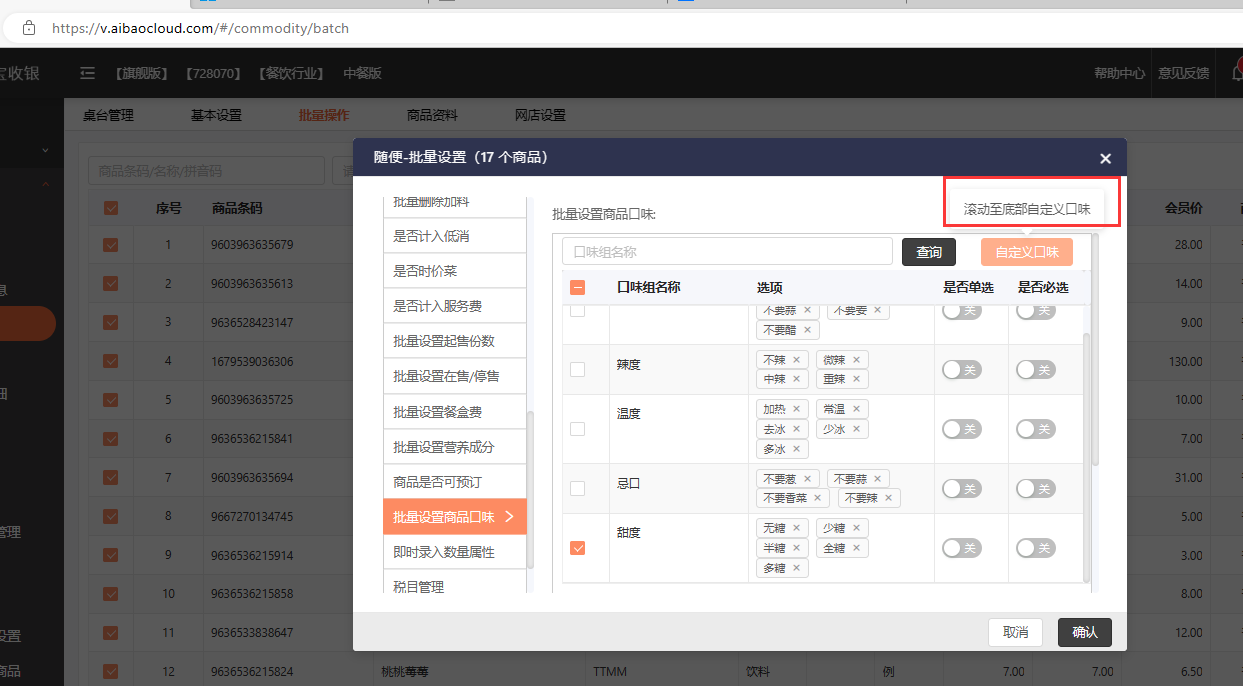 在商品管理中找到批量操作,找到需要批量设置口味的商品,勾选,然后点击批量设置