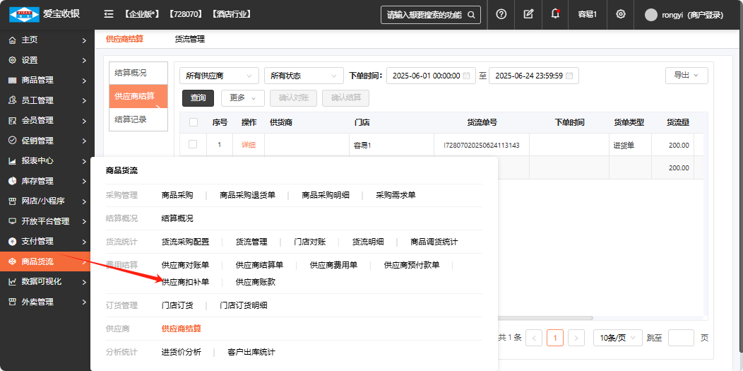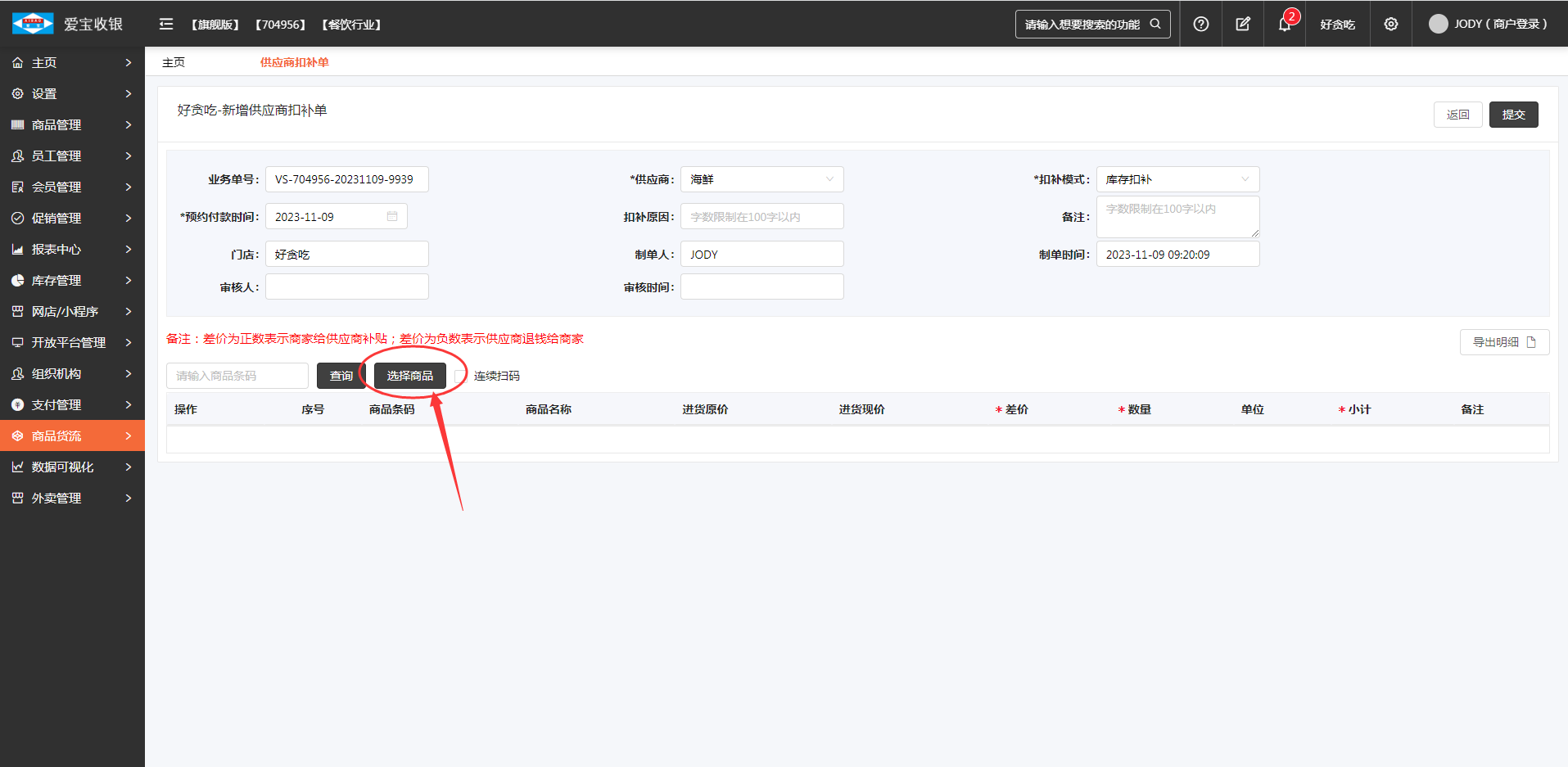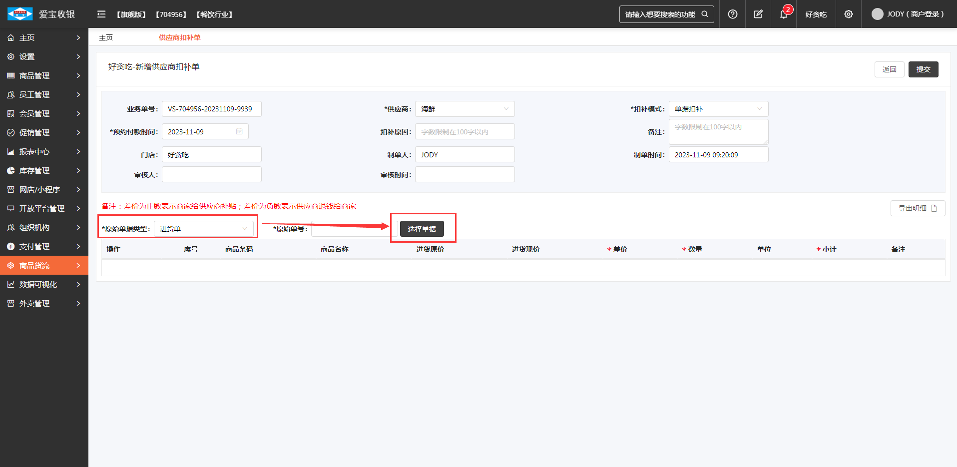 2、“货流管理”-->“供应商扣补单”-->“新增”;
