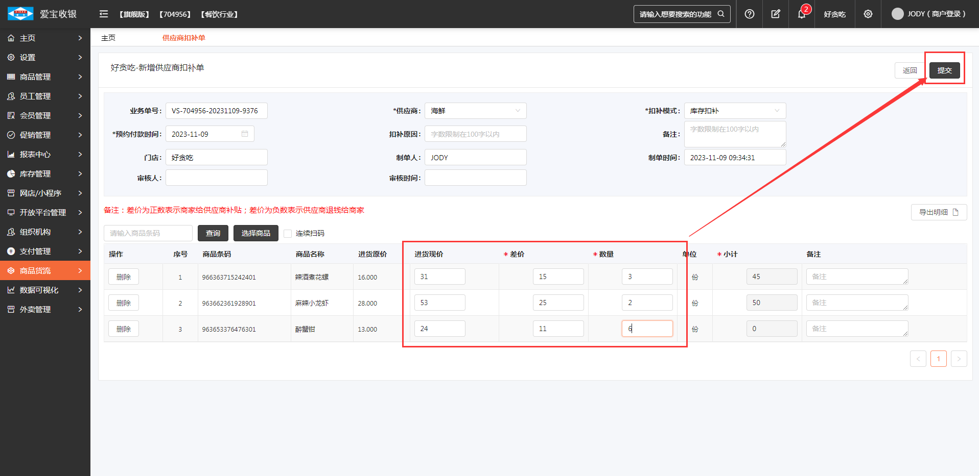 输入“进货现价”、“差价”、“数量”,最后点击“提交”;