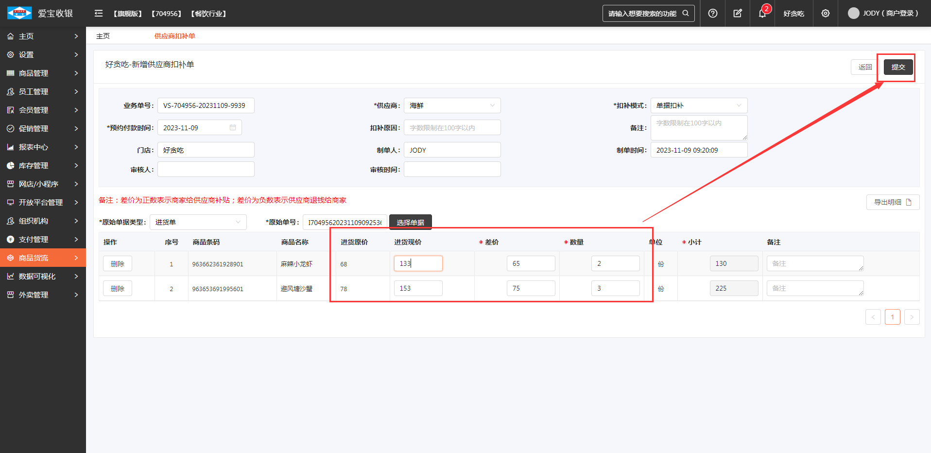 注意:差价为正数表示商家给供应商补贴;差价为负数表示供应商退钱给商家