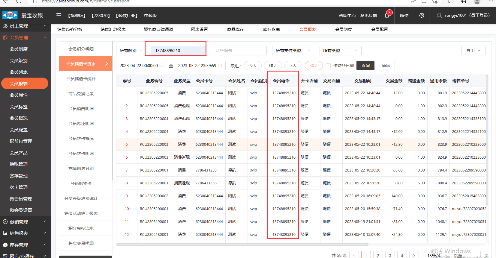 美食云旗舰版使用手机号搜索会员储值卡流水教程