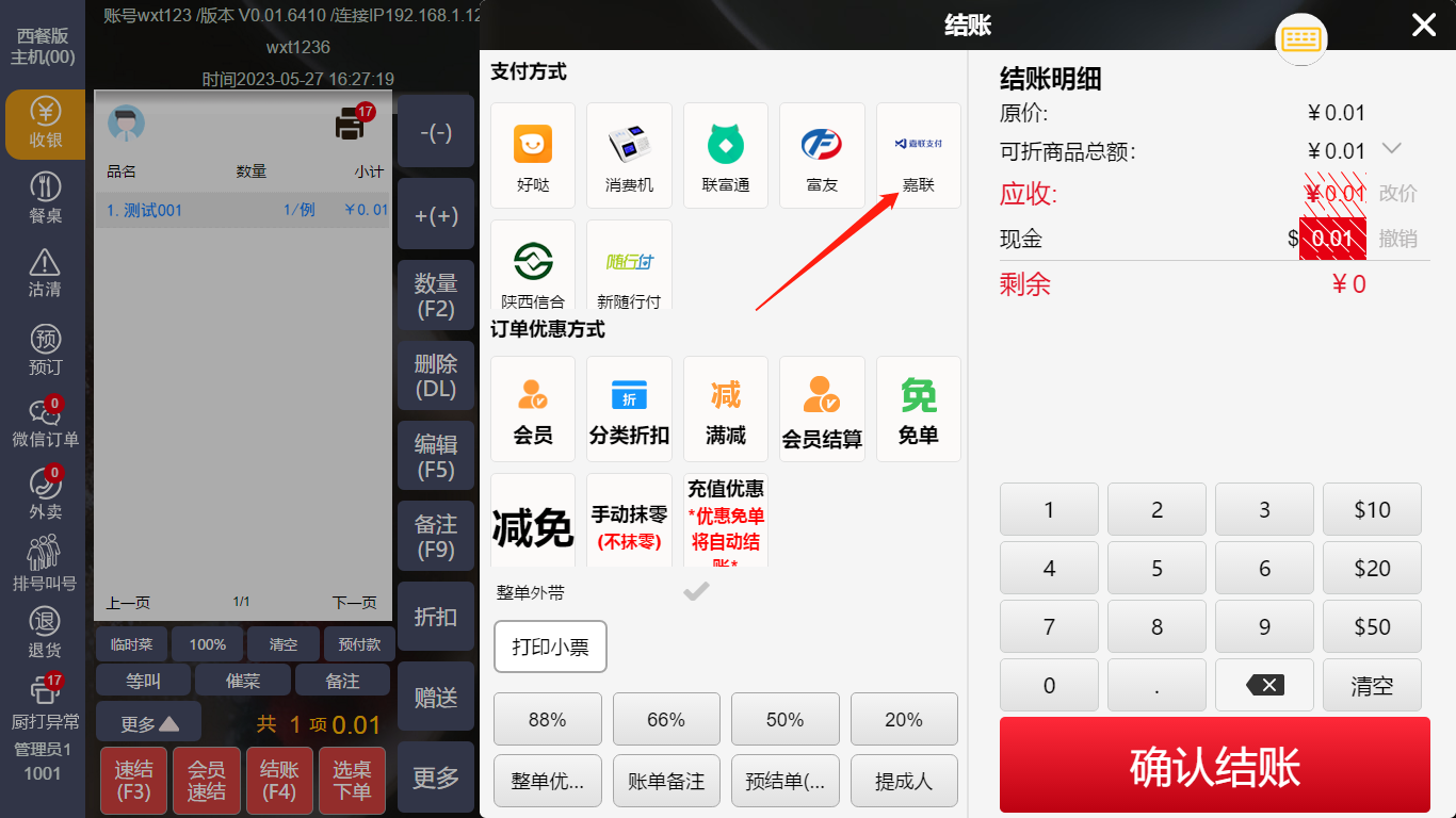 6.配置收银前台,前台收款时付款式请选择【嘉联】如下图所示
