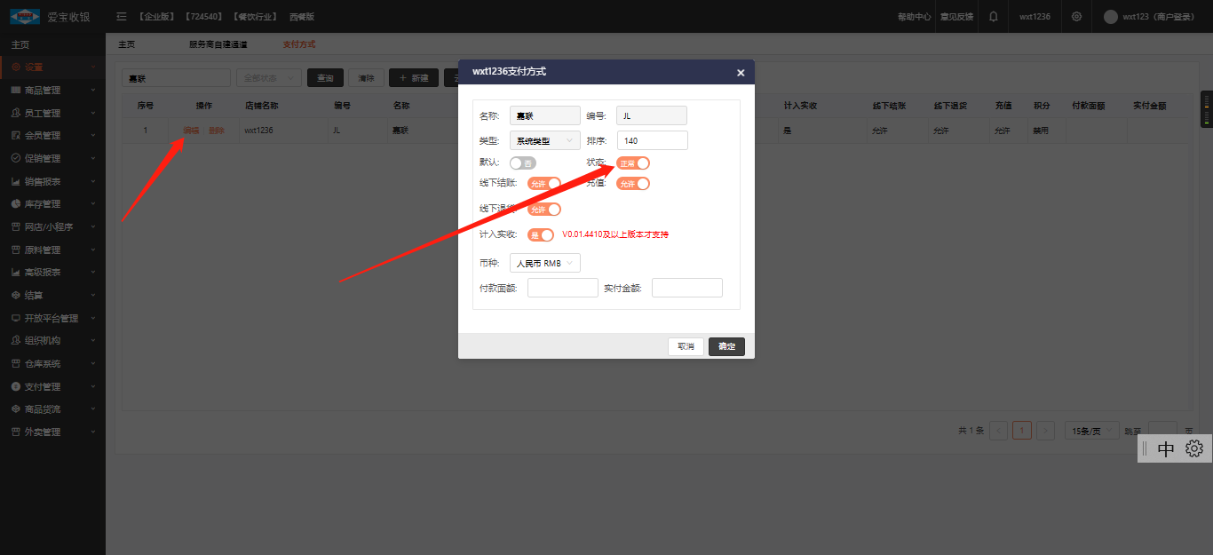 4.进入后台设置-->支付方式把【嘉联】启用。