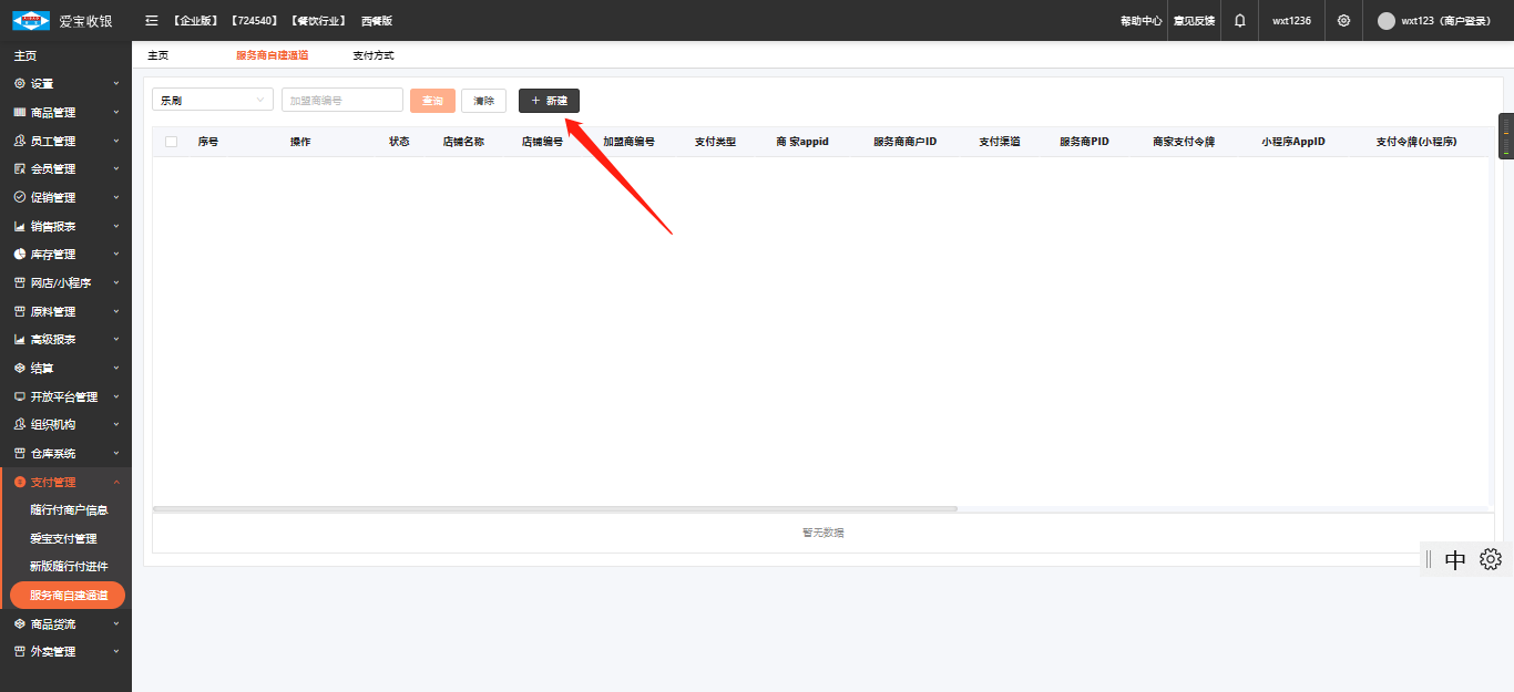 2.新建支付通道。支付管理-->服务商支付通道-->新建(如下图)