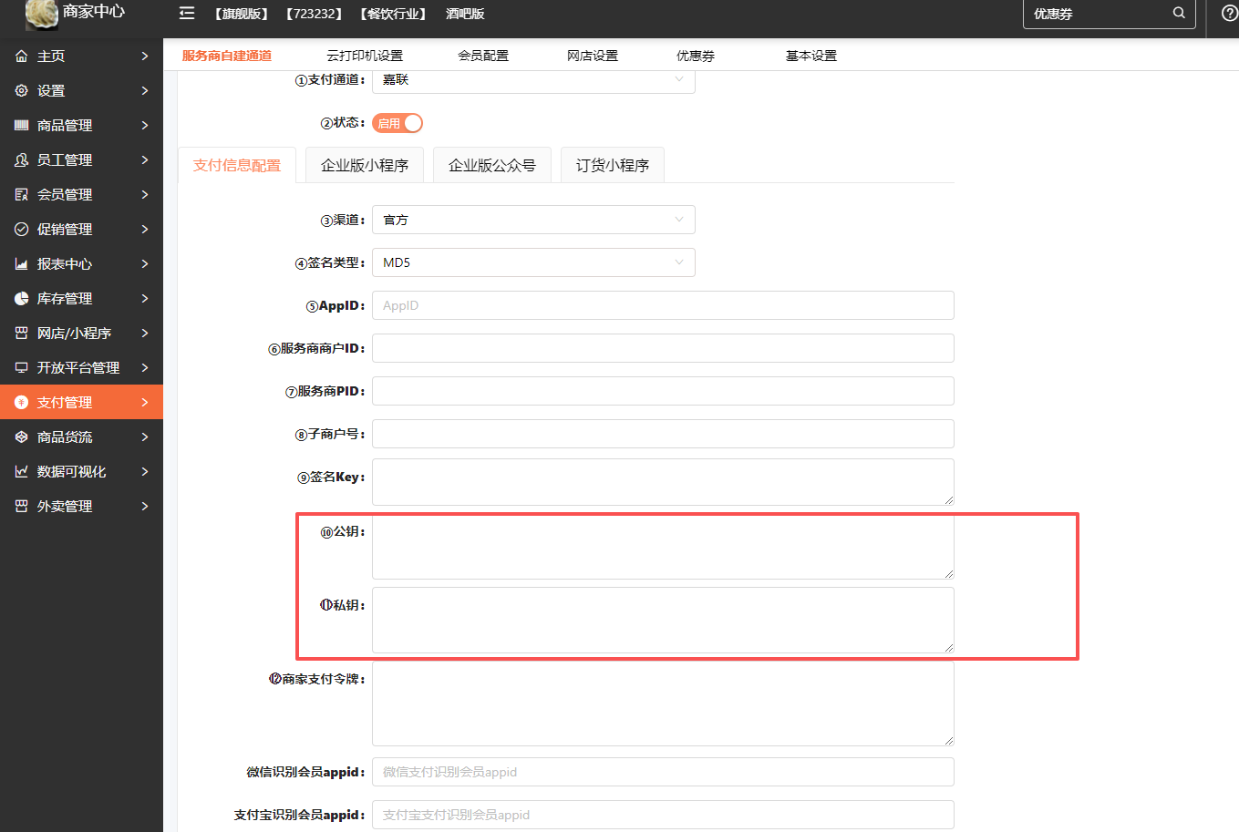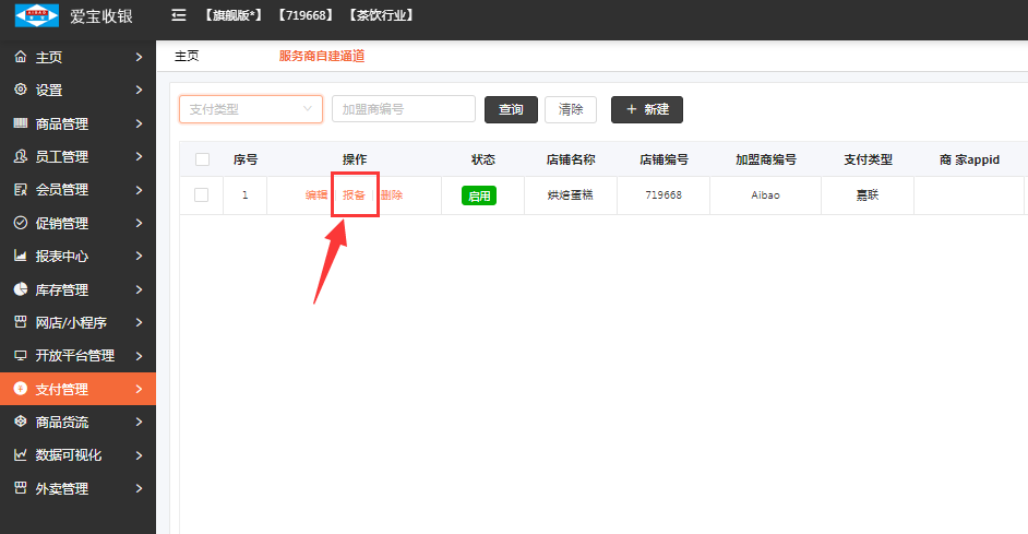 5.配置美食云前台。登录爱宝云美食云前台,进入系统设置-->店铺信息-->移动支付里点击开通自建支付通道(如下图)