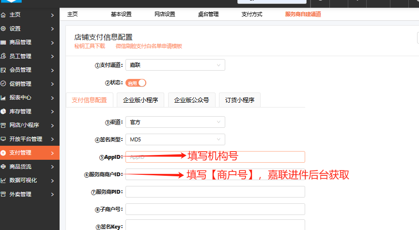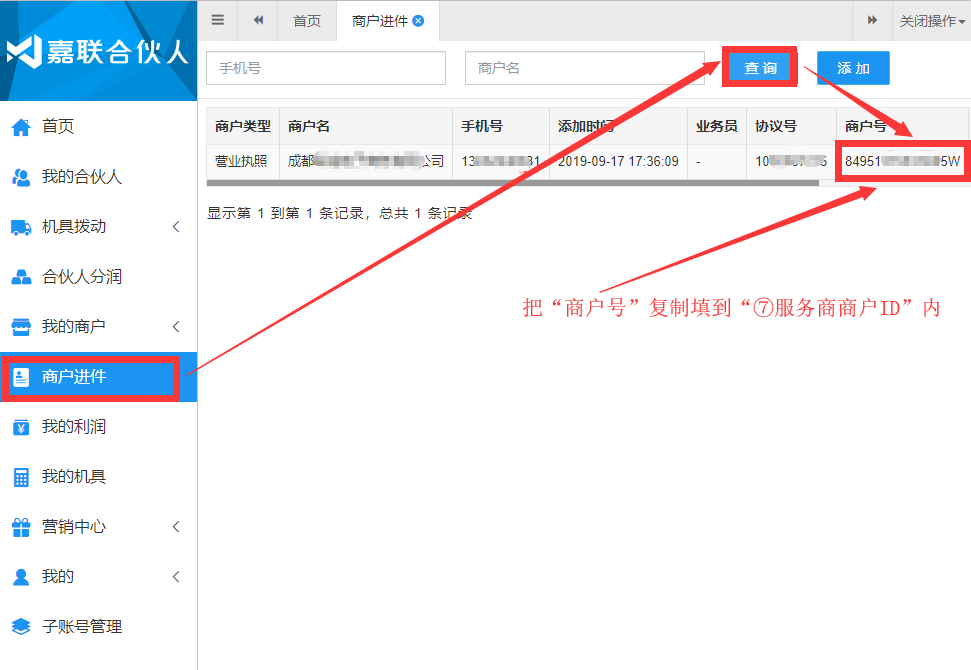 服务商商户ID”填写已进件成功商户的“商户号”请登录嘉联进件后台获取,如下图: