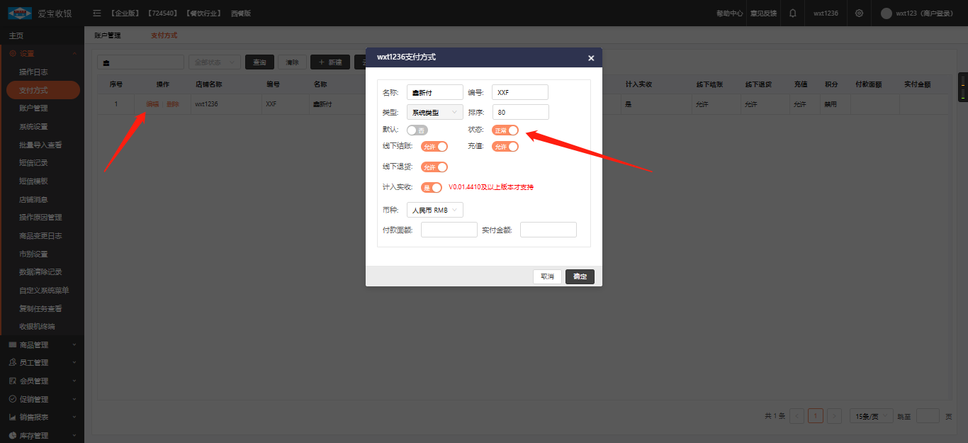 3.进入后台设置-->支付方式把【鑫新付】启用。