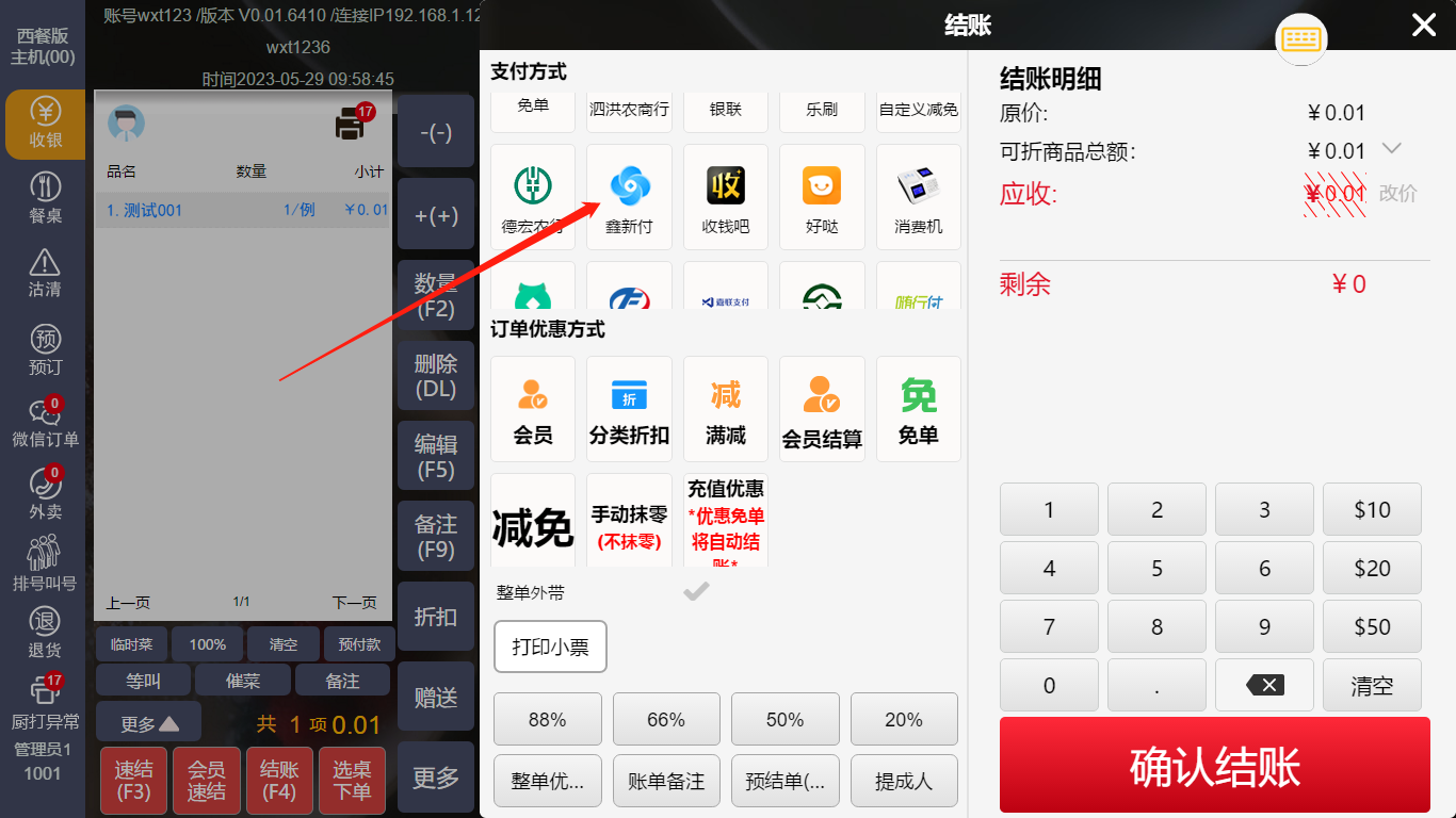 5.配置收银前台,前台收款时付款式请选择【鑫新付】如下图所示