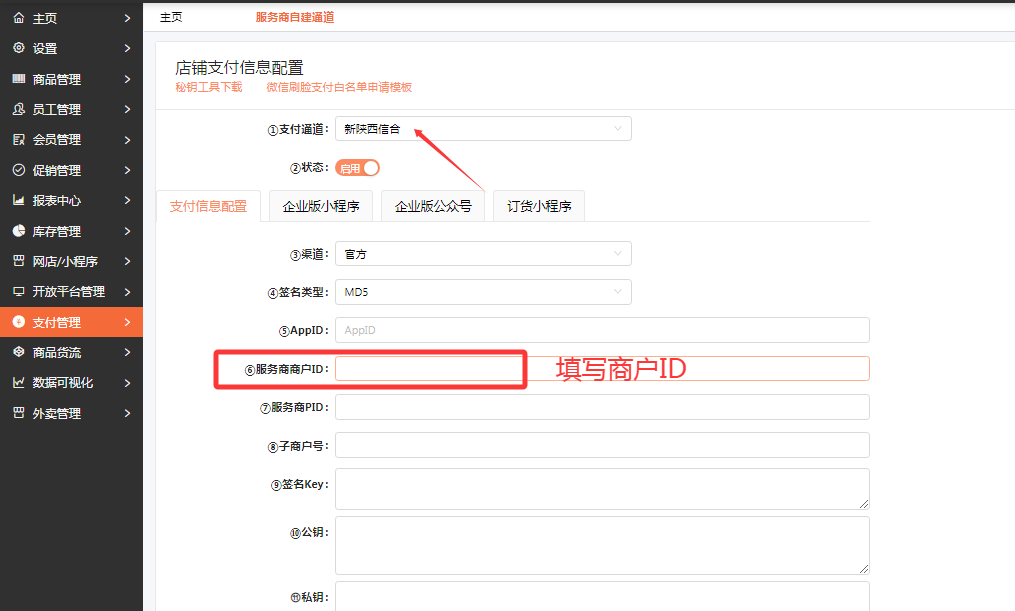 在【支付管理】--【自建支付通道】中选择【新陕西信合】支付方式,服务商商户ID 填写商户ID 并点击确定保存