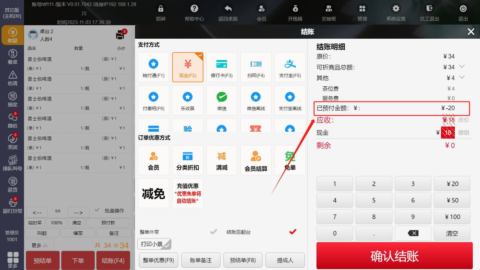 5,付款成功后桌台界面会显示已经预付的金额;