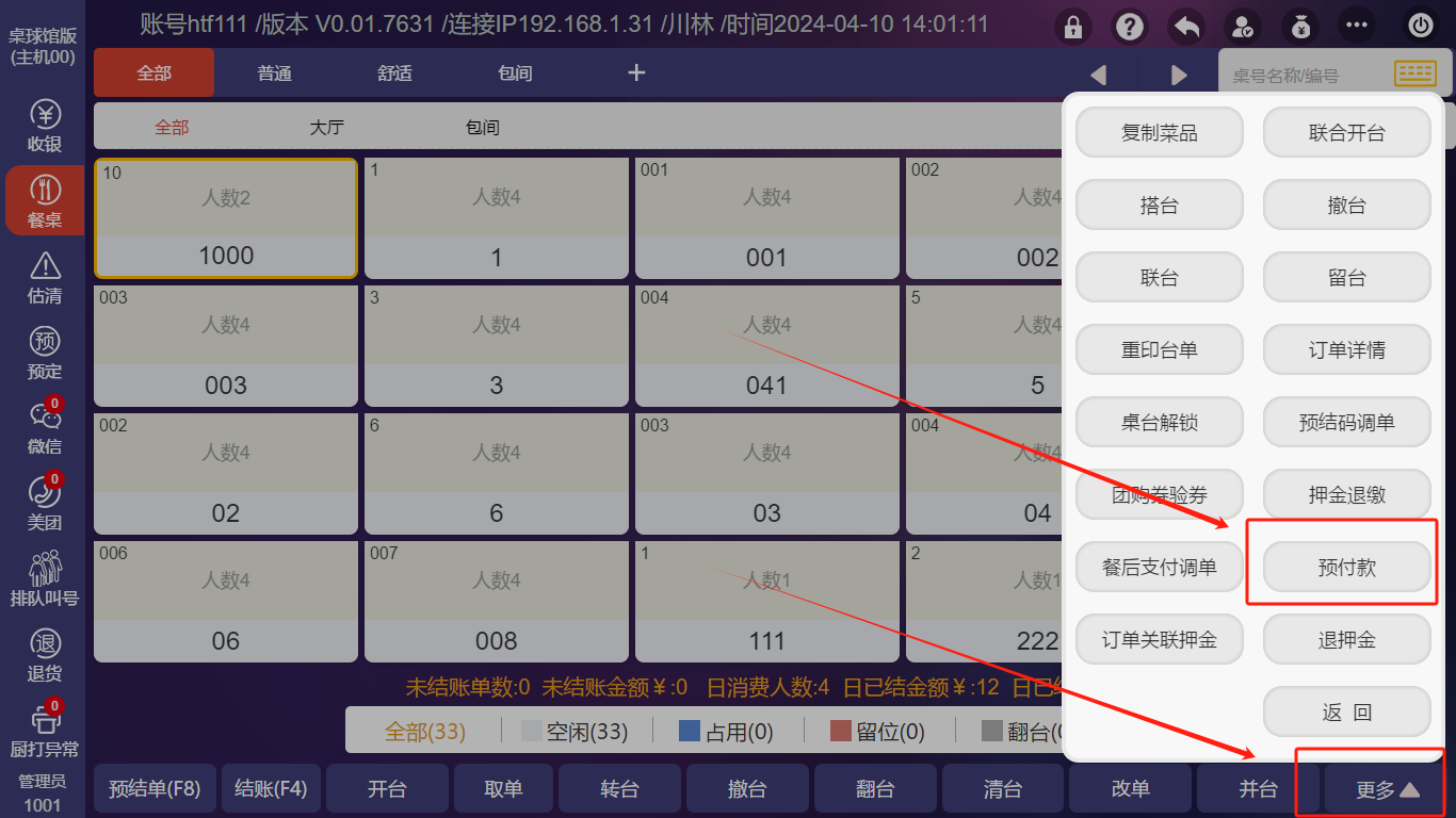 或者在桌台页面选中桌台点击更多——预付款