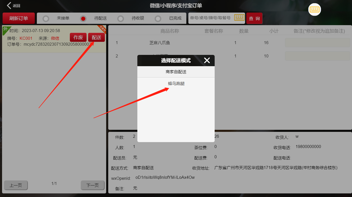 5、打开前台微信订单,接单配送选“蜂鸟配送”