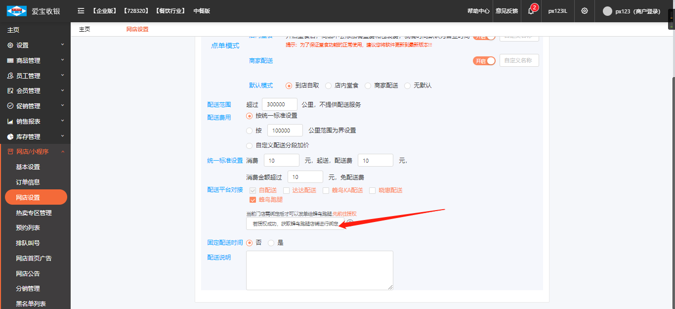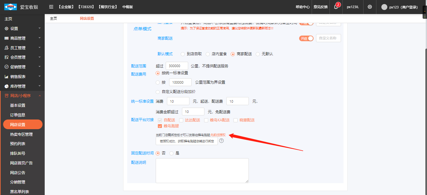 蜂鸟通过后,进入后台,网点设置--配送设置--选择授权店铺,可以看到到刚刚授权的门店,选择刚刚添加的门店