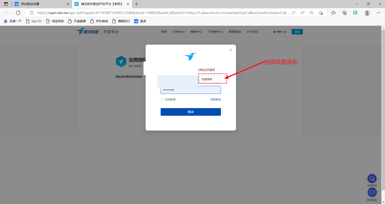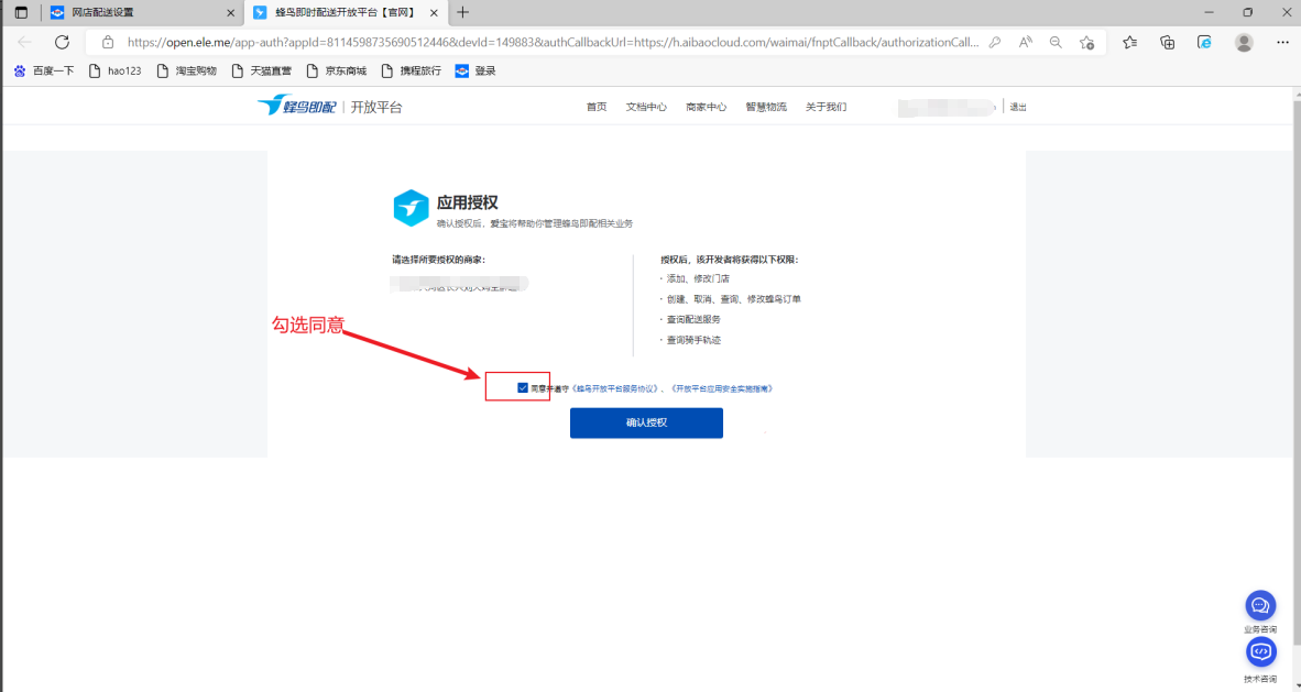 登录进入应用授权,勾选同意并遵守确认授权(已授权的可以直接点击导航栏中的商家中心)