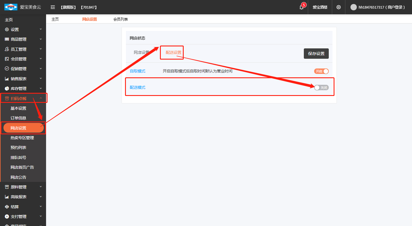 3、到“扫码点餐”-->”网店设置”-->”配送设置”中开启“配送模式”;