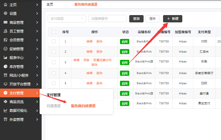 第二步,新建支付通道。支付管理-服务商支付通道-新建(如下图)