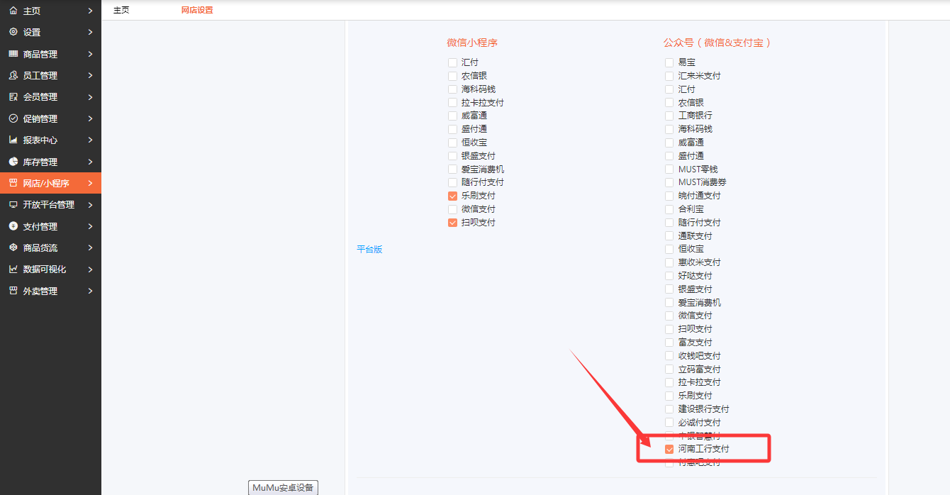 5.配置好信息后,在【扫码点餐】-->【网店设置】-->【付款设置】勾选上河南工行微信支付,并点击保存