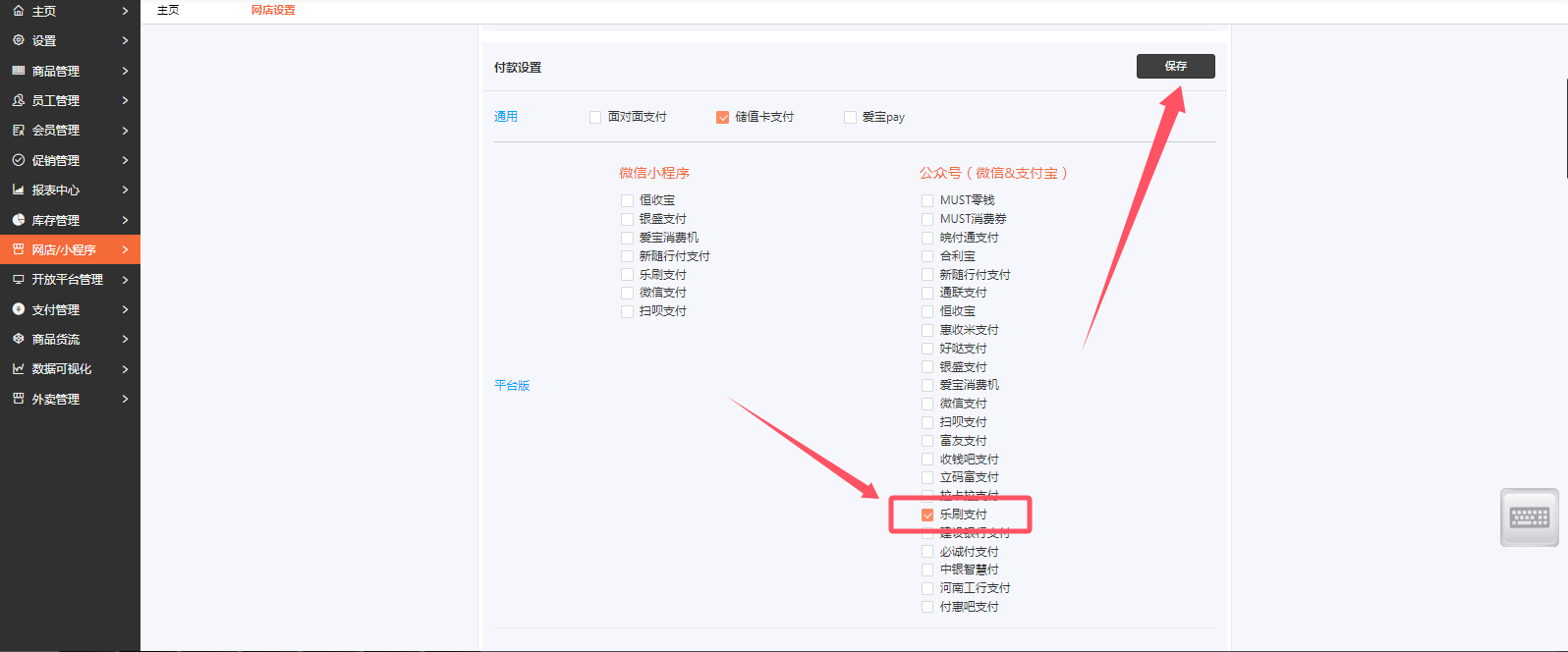 5.配置好信息后,在【扫码点餐】-->【网店设置】-->【付款设置】勾选上乐刷微信支付,并点击保存