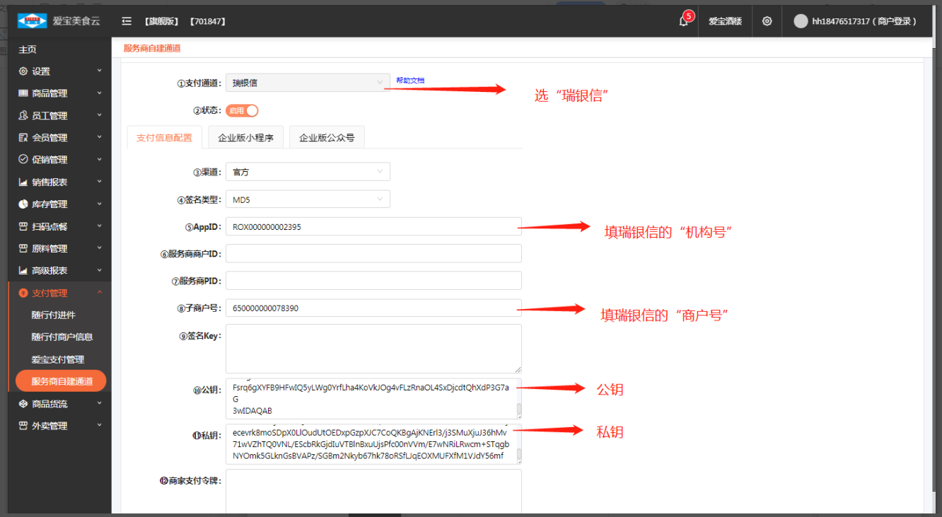 美食云旗舰版对接瑞银信支付设置教程