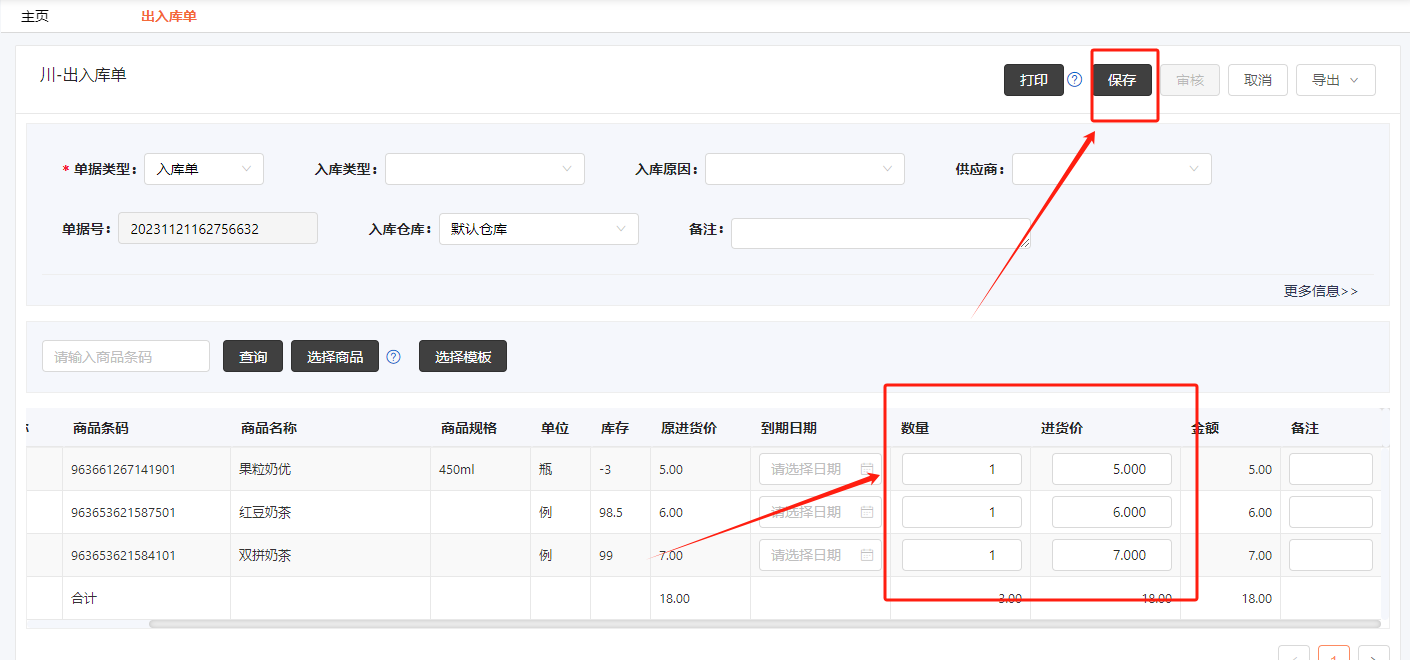 4、输入数量、进货价、备注(可不填)--->保存--->审核选择“是”--->最点“确定”即可;