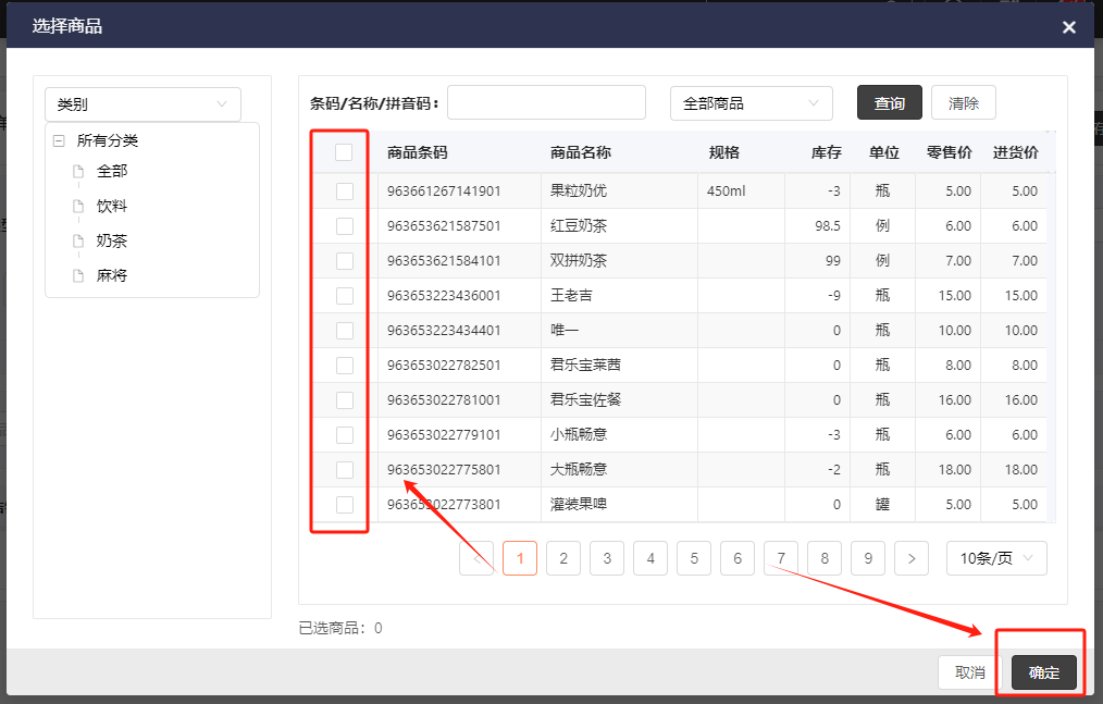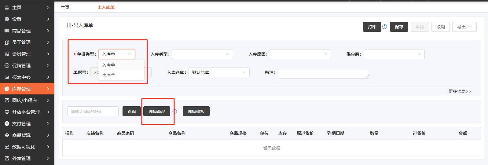 3、选择出库或入库--->选择出入库商品;