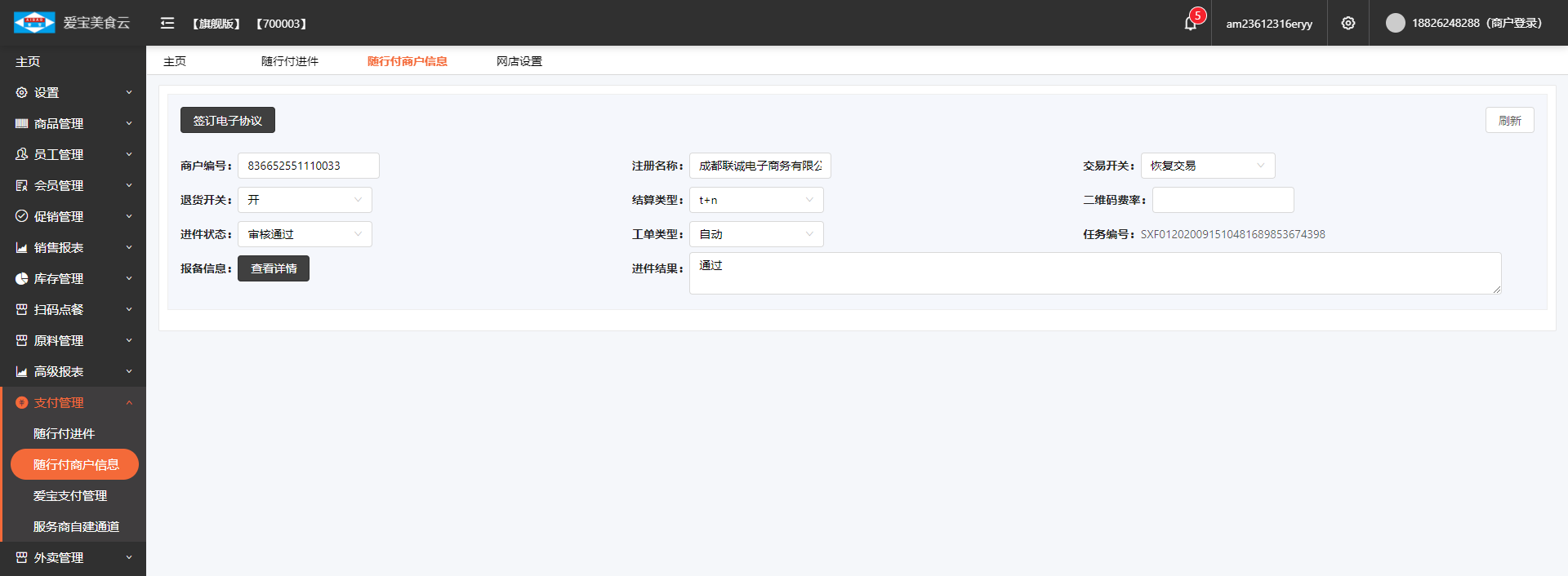 2、需要再美食云后台,申请开通随行付支付通道,审核通过后才能配置(大概需要1~2个工作日即可)