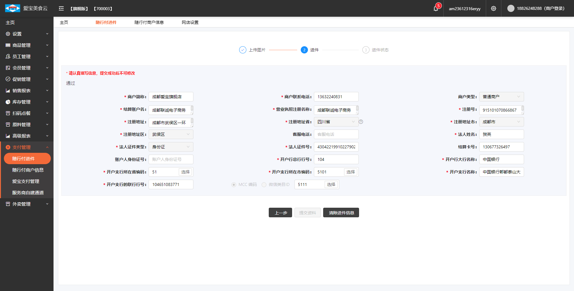 第二步,在【支付管理】--【随行付进件】和【随行付商户信息】中填写资料进行进件