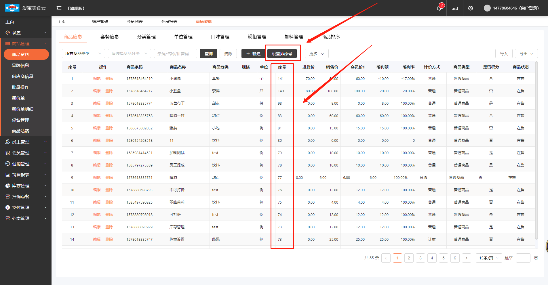 在【商品管理】---【商品资料】内的【商品信息】中,点击【设置排序号】进行调整