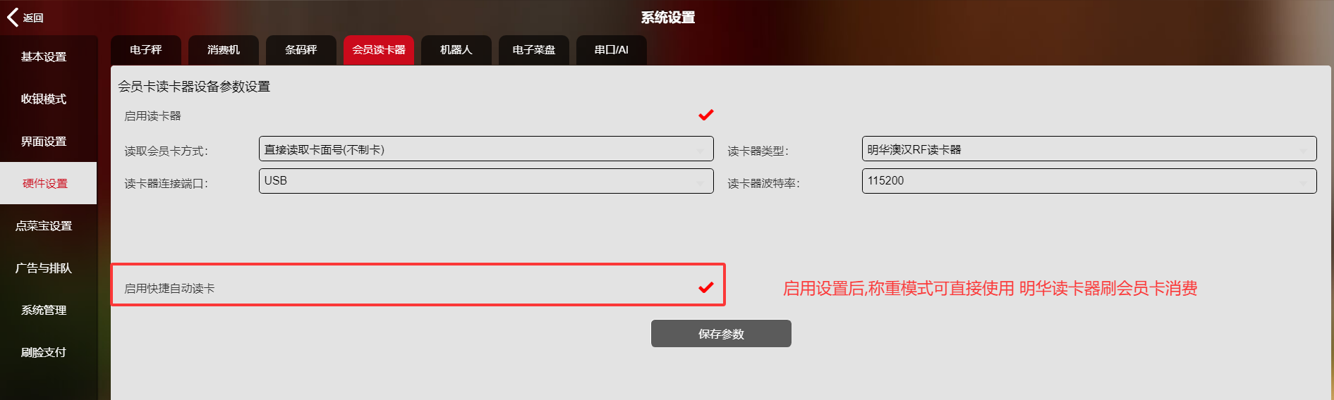 启用下图所示设置,可支持使用明华读卡器(URF-R330)直接刷会员卡扣费